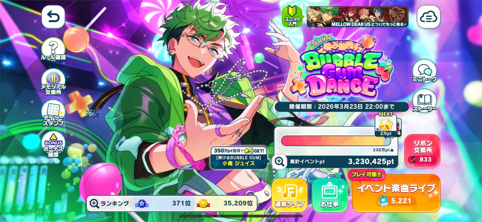 1日目🍭 ・💎×308お得パックにくっついてくるホイッスルと報酬のメガホンあるだけ消費した女王様完凸できたお陰で周回曲の主力がWwysに変わったことにより大分楽に周回できてる優しい譜面だから疲れも溜まりにくくてストレスフリーでやれてるし…まあ譜面が簡単すぎて次第に飽きてくるし眠くなったりするけど🫥